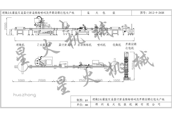 理瓶2頭灌裝真空旋蓋貼標噴碼收瓶及開箱封箱打包生產線